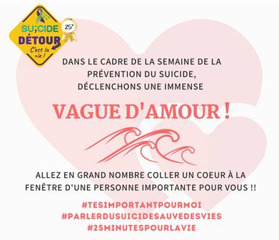 La Table de développement Social Vallée de la Gatineau vous invite à appuyer Suicide Détour dans sa Vague D’amour en confectionnant un cœur ayant un mot d’amour d’inscrit dessus et en allant coller celui-ci à la fenêtre
