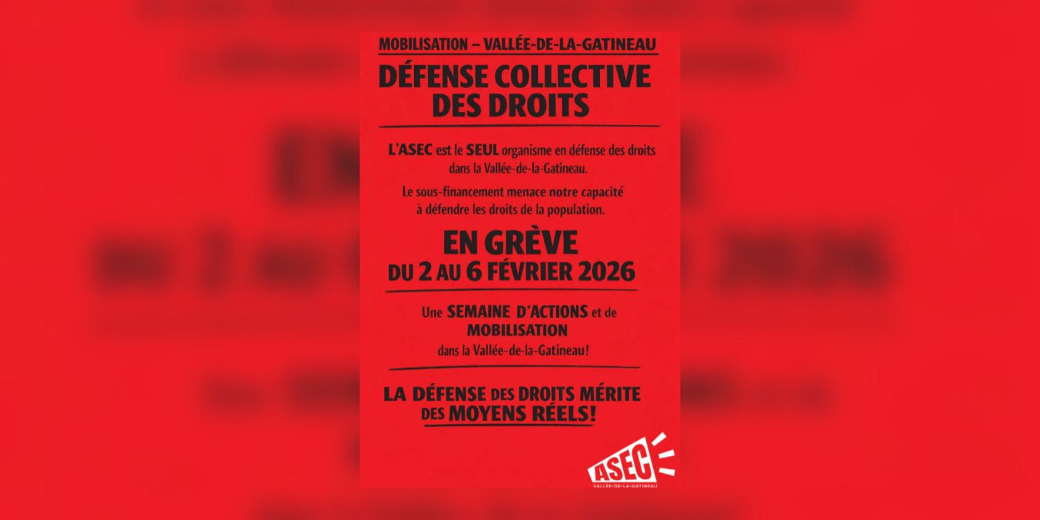 L’Association de solidarité et d’entraide communautaire de la Vallée-de-la-Gatineau (ASEC) est en grève à partir de ce lundi 2 février jusqu’au vendredi 6 février dans le cadre d’une mobilisation nationale des organismes en défense collective des droits. Ils dénoncent l’inaction du gouvernement et exigent un financement à la mission adéquat, récurrent et indexé.
