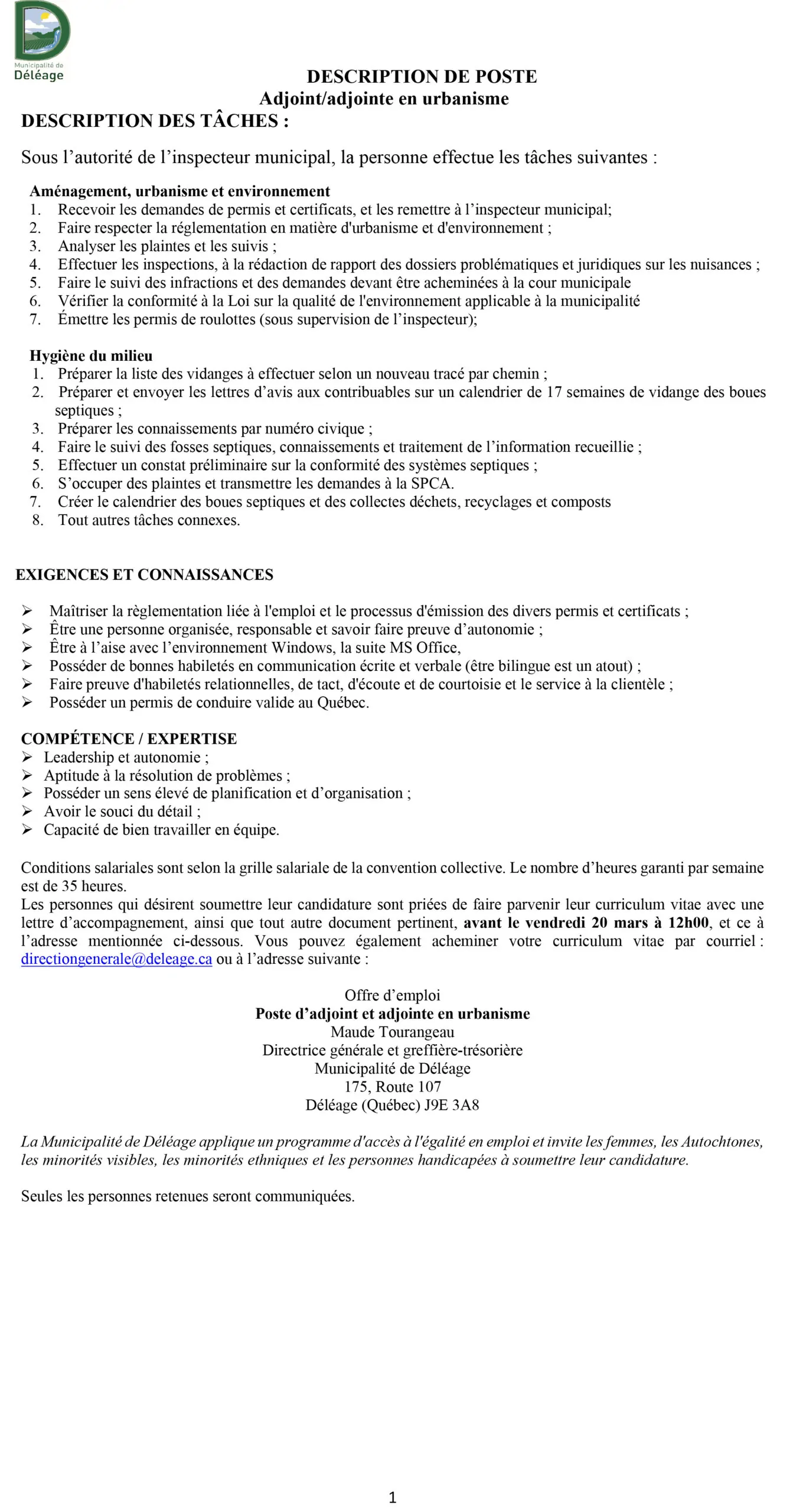 Sous l’autorité de l’inspecteur municipal, la personne effectue les tâches suivantes : Recevoir les demandes de permis et certificats, et les remettre à l’inspecteur municipal; Faire respecter la réglementation en matière d'urbanisme et d'environnement ; Analyser les plaintes et les suivis ;