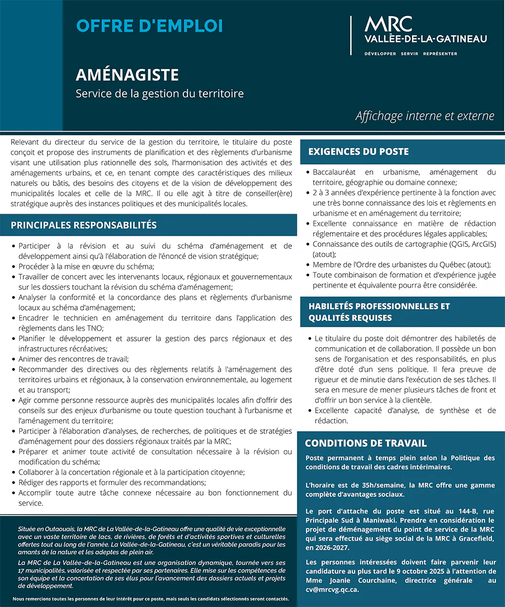 Relevant du directeur du service de la gestion du territoire, le titulaire du poste conçoit et propose des instruments de planification et des règlements d’urbanisme visant une utilisation plus rationnelle des sols, l’harmonisation des activités et des aménagements urbains, et ce, en tenant compte des caractéristiques des milieux naturels ou bâtis, des besoins des citoyens et de la vision de développement des municipalités locales et celle de la MRC. Il ou elle agit à titre de conseiller(ère) stratégique auprès des instances politiques et des municipalités locales.