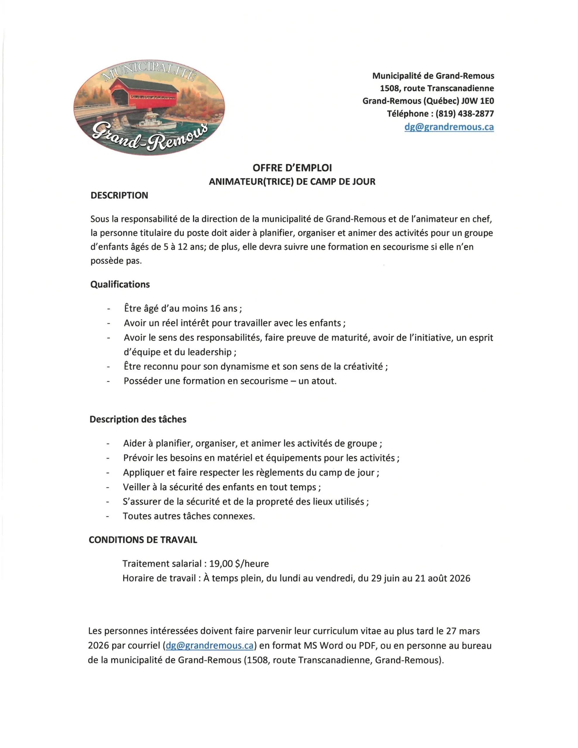 Sous la responsabilité de la direction de la municipalité de Grand-Remous et de l'animateur en chef, la personne titulaire du poste doit aider à planifier, organiser et animer des activités pour un groupe d'enfants âgés de 5 à 12 ans; de plus, elle devra suivre une formation en secourisme si elle n'en possède pas.