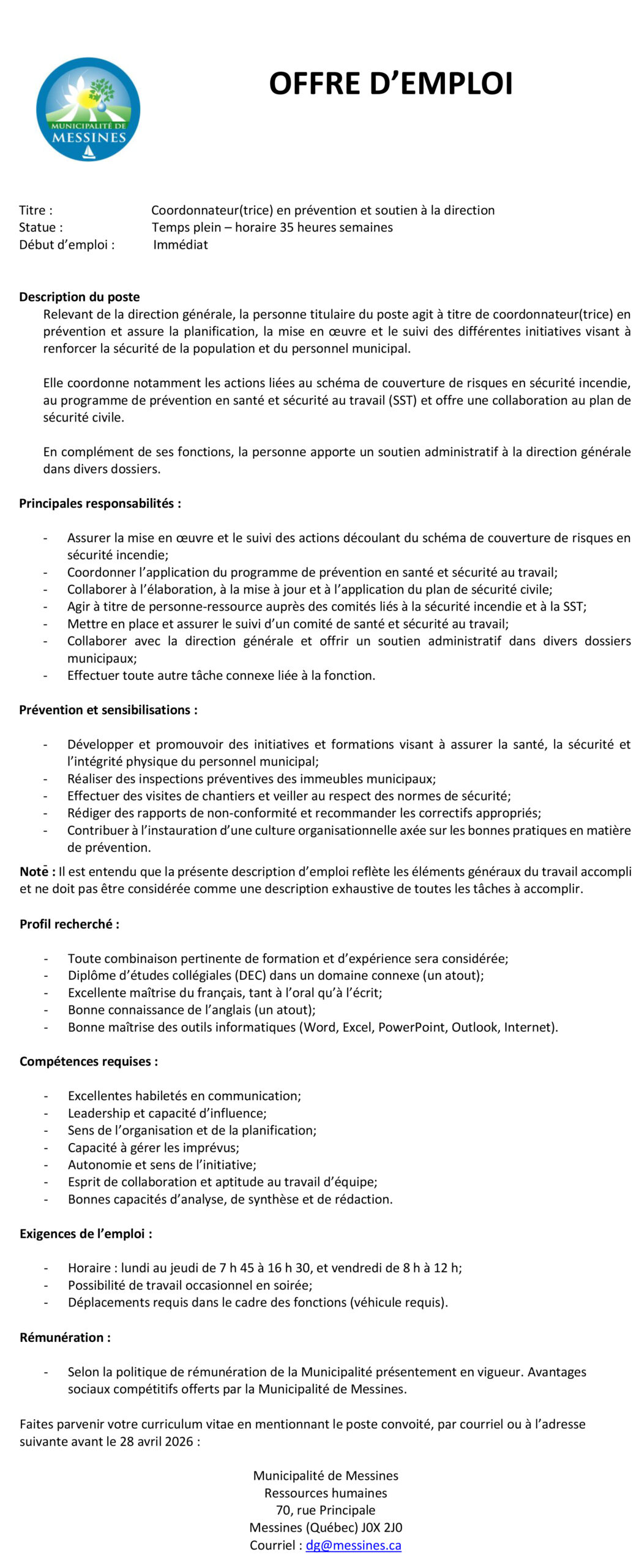 Offre d'emploi - Coordonateur(trice) en prévention et soutien à la direction - Municipalité Messines