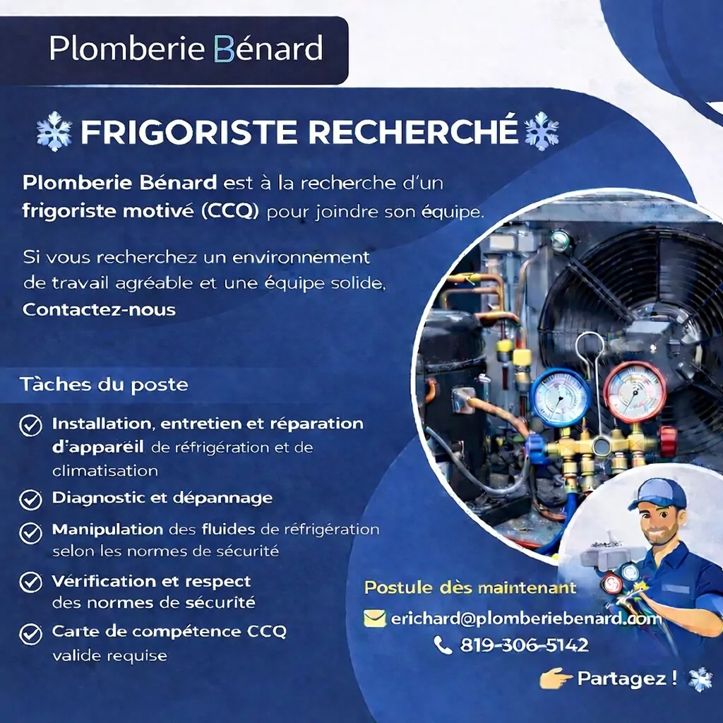 Plomberie Bénard est à la recherche d'un frigoriste motivé (CCQ) pour joindre son équipe. Si vous recherchez un environnement de travail agréable et une équipe solide,