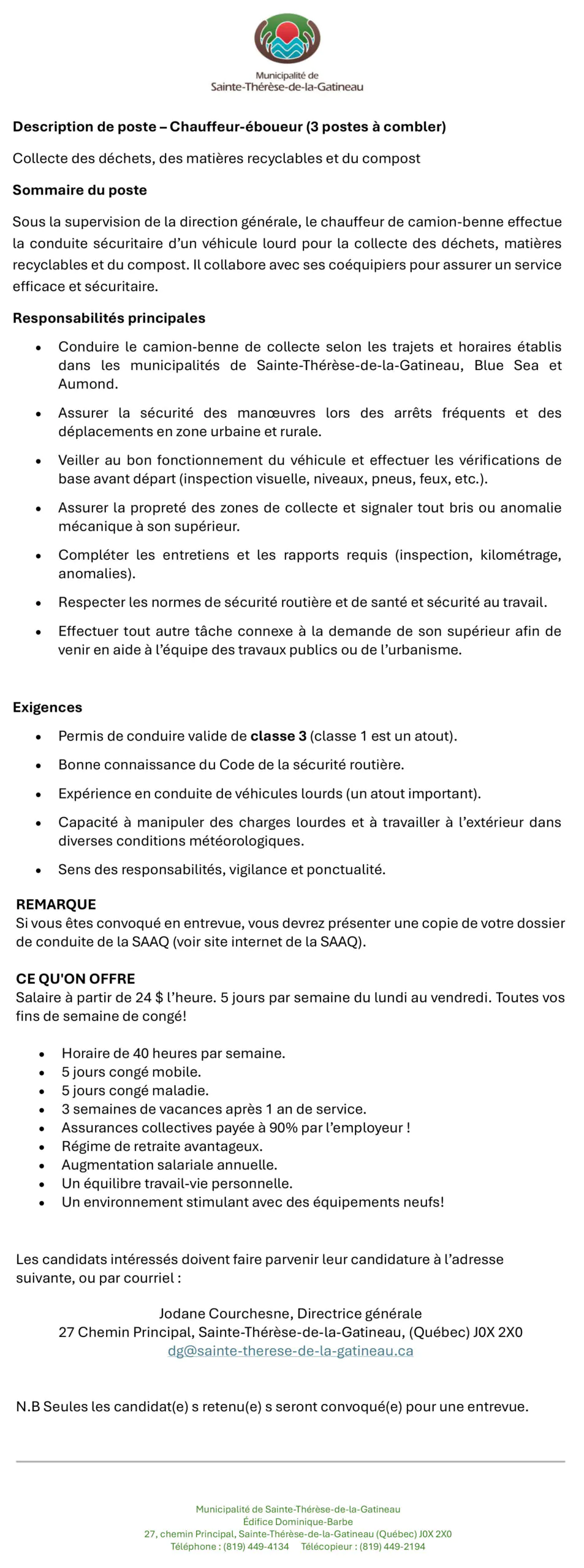Offre d'emploi - Municipalité de Sainte-Thérèse-de-la-Gatineau - Chauffeur - éboueur