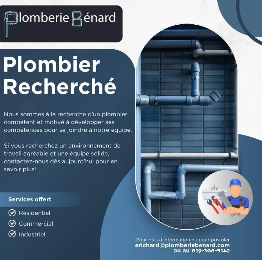 Nous sommes à la recherche d'un plombier compétent et motivé à développer ses compétences pour se joindre à notre équipe.