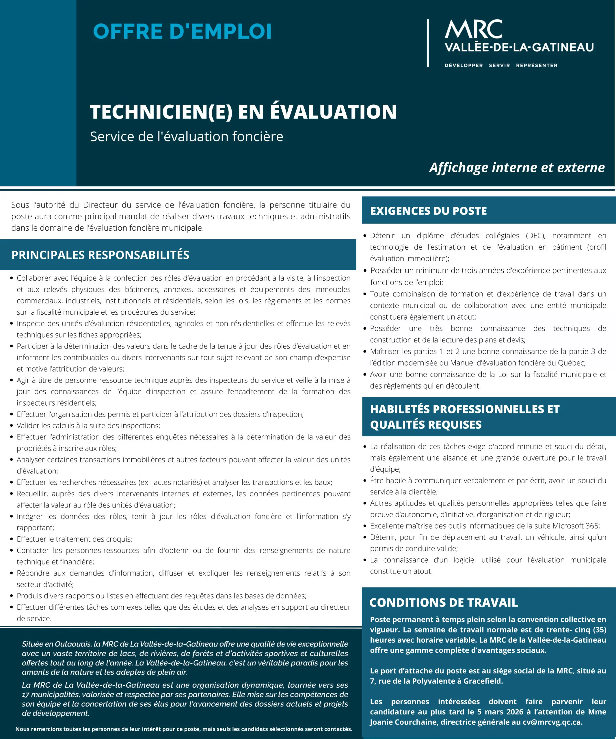 Sous l’autorité du Directeur du service de l’évaluation foncière, la personne titulaire du poste aura comme principal mandat de réaliser divers travaux techniques et administratifs dans le domaine de l’évaluation foncière municipale.